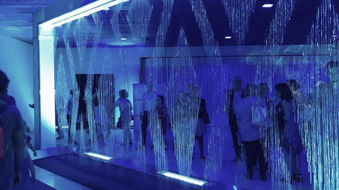 An interactive water wall creates falling images using water droplets.